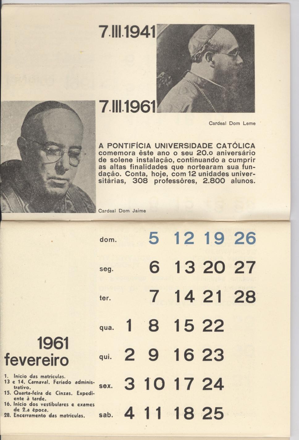 Calendário referente mês de Fevereiro de 1961. Contém informações sobre a Universidade e fotografias do Cardeal Dom Sebastião Leme e do Cardeal Dom Jaime de Barros Câmara. Edição comemorativa do aniversário de 20 anos da Universidade.