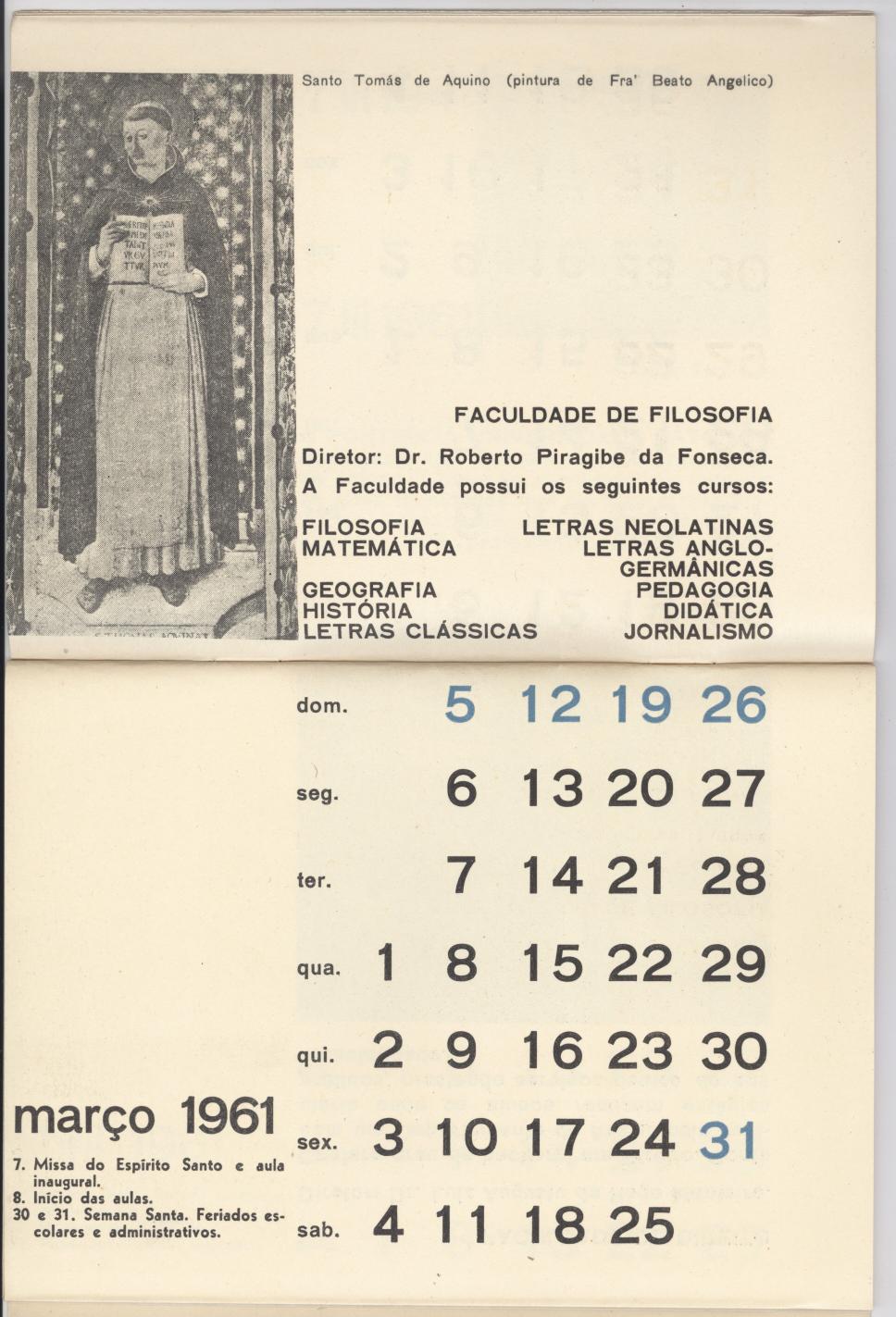 Calendário referente mês de Março de 1961. Contém informações sobre a Faculdade de Filosofia e imagem de São Tomás de Aquino. Edição comemorativa do aniversário de 20 anos da Universidade.