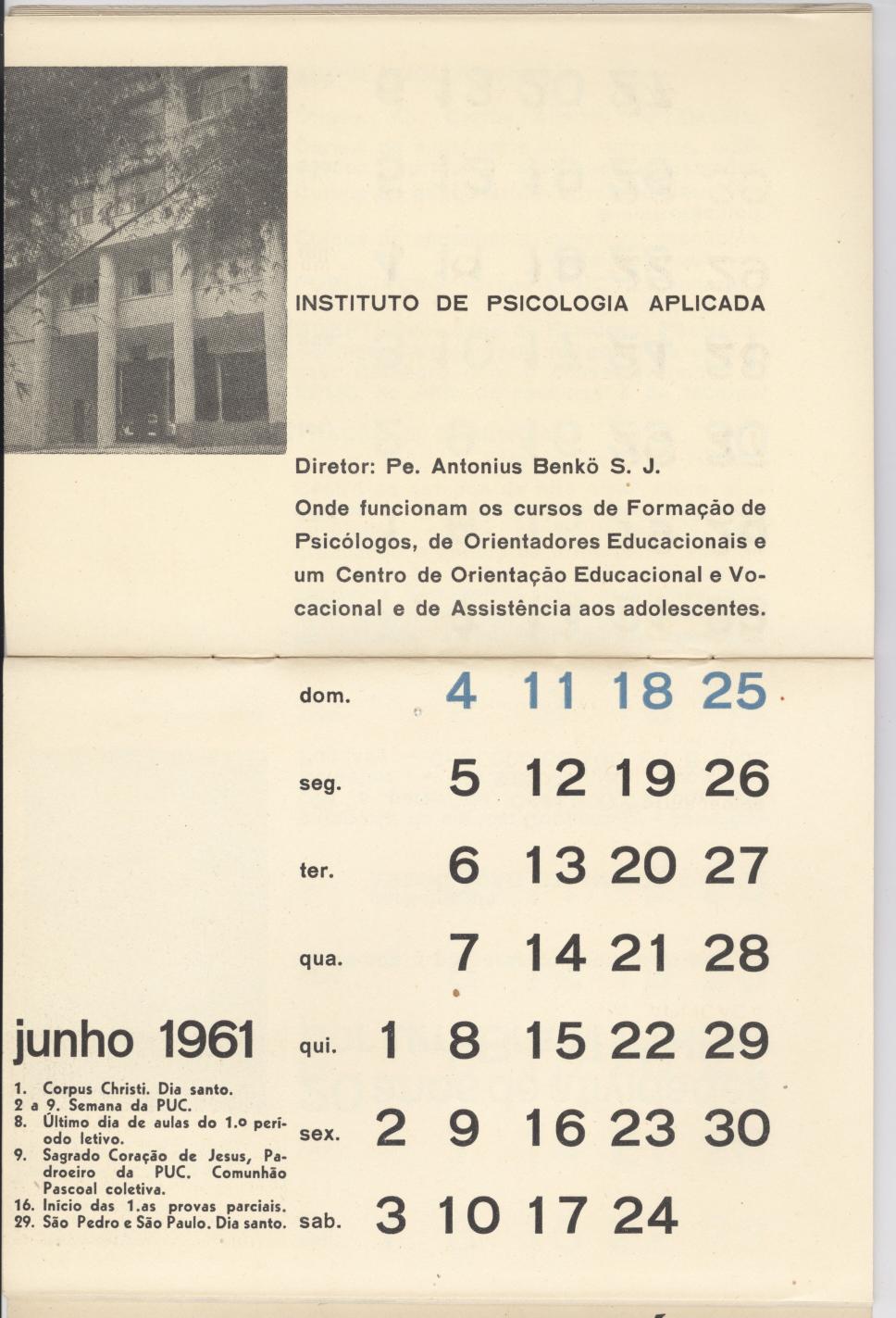 Calendário referente mês de Junho de 1961. Contém informações sobre o Instituto de Psicologia Aplicada. Edição comemorativa do aniversário de 20 anos da Universidade. Foto do Edifício Central (Cardeal Leme).