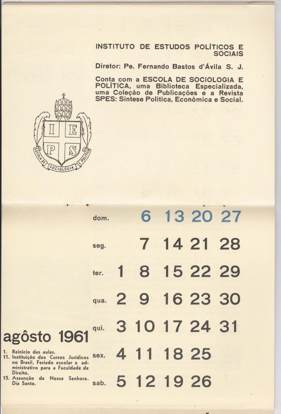 Calendário referente mês de Agosto de 1961. Contém informações sobre o Instituto de Estudos Políticos e Sociais. Edição comemorativa do aniversário de 20 anos da Universidade.
