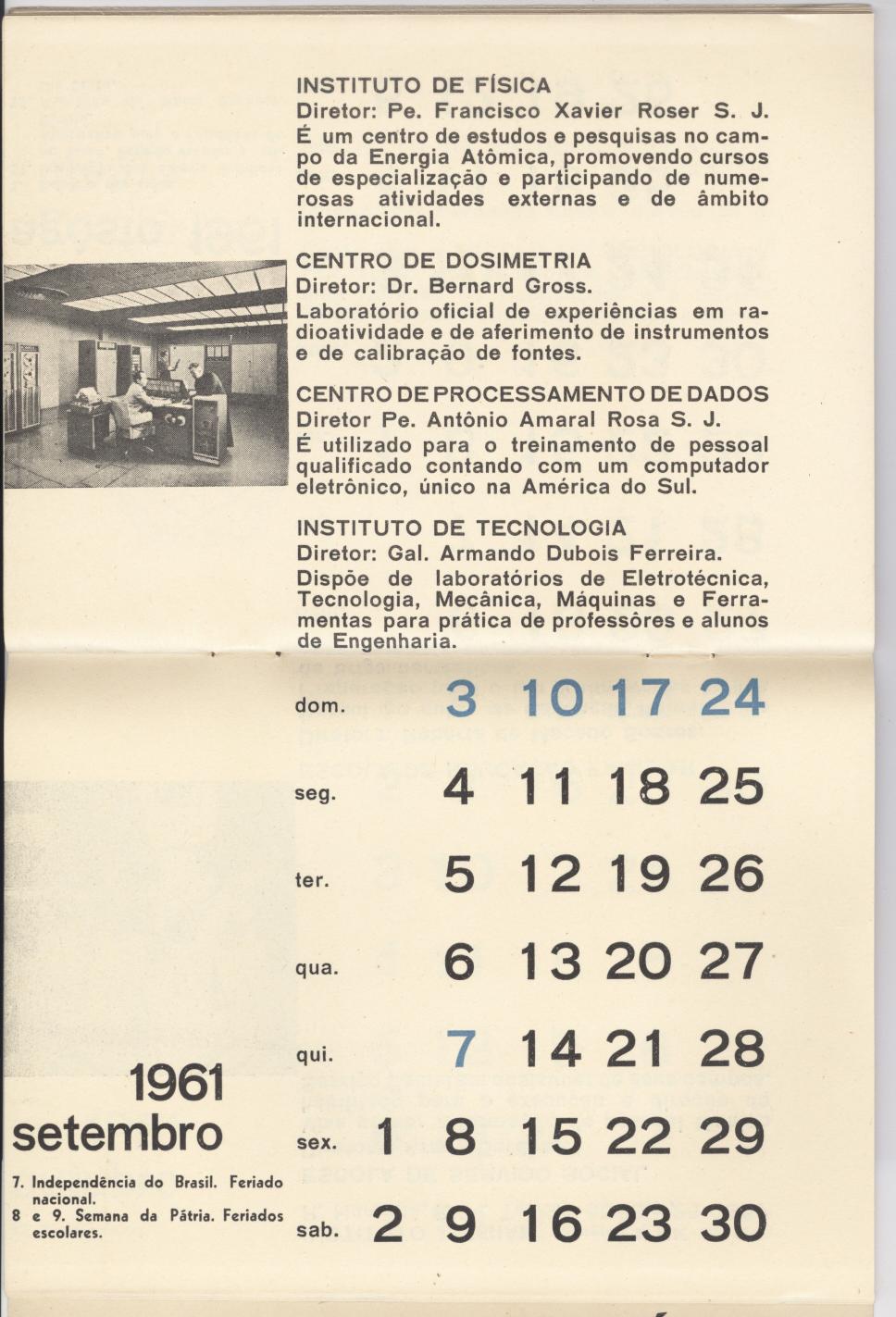 Calendário referente mês de Setembro de 1961. Contém informações sobre o Instituto de Física, o Centro de Dosimetria, o Centro de Processamento de Dados e o Instituto de Tecnologia. Edição comemorativa do aniversário de 20 anos da Universidade. Foto do CPD com o computador Burroughs 205.