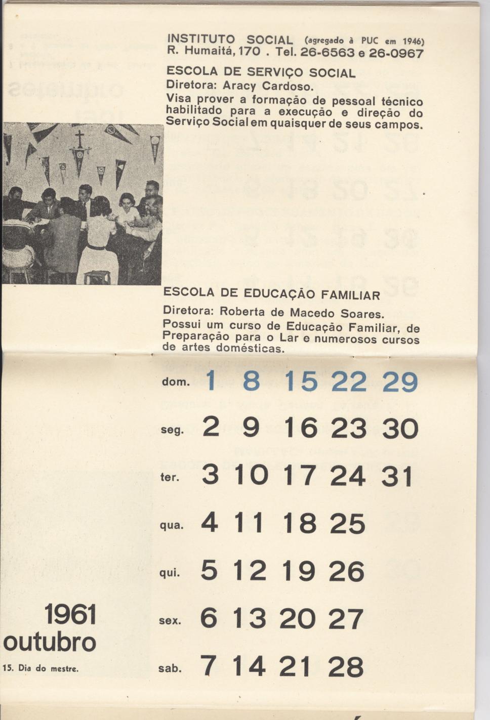 Calendário referente mês de Outubro de 1961. Contém informações sobre o Instituto Social, a Escola de Serviço Social e a Escola de Educação Familiar. Edição comemorativa do aniversário de 20 anos da Universidade. Imagem de um grupo de alunos em sala com muitas flâmulas na parede.