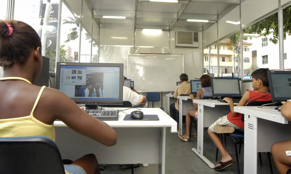 Moradores fazem uso de computadores em projeto de inclusão digital implantado com apoio da PUC-Rio através do Cetuc.