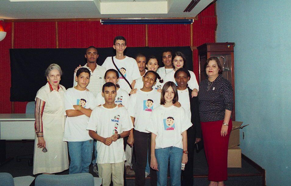 Alunos da Rede Pública ao lado das professoras Maria Helena Novais e Marina Moreira.