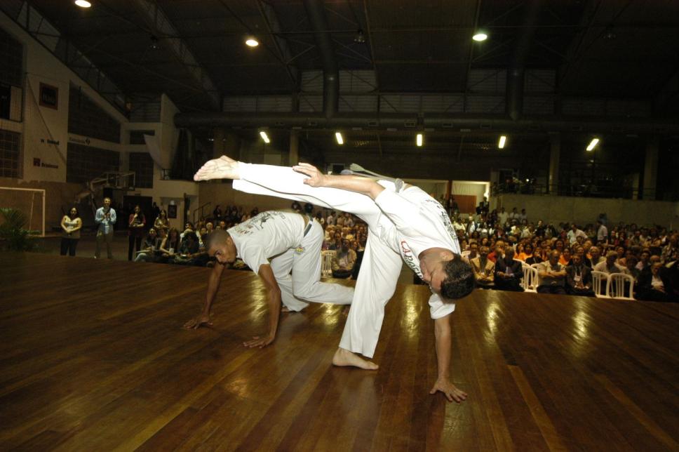 Jovens jogam capoeira no palco do ginásio da PUC-Rio. Vê-se, ao fundo, a plateia.