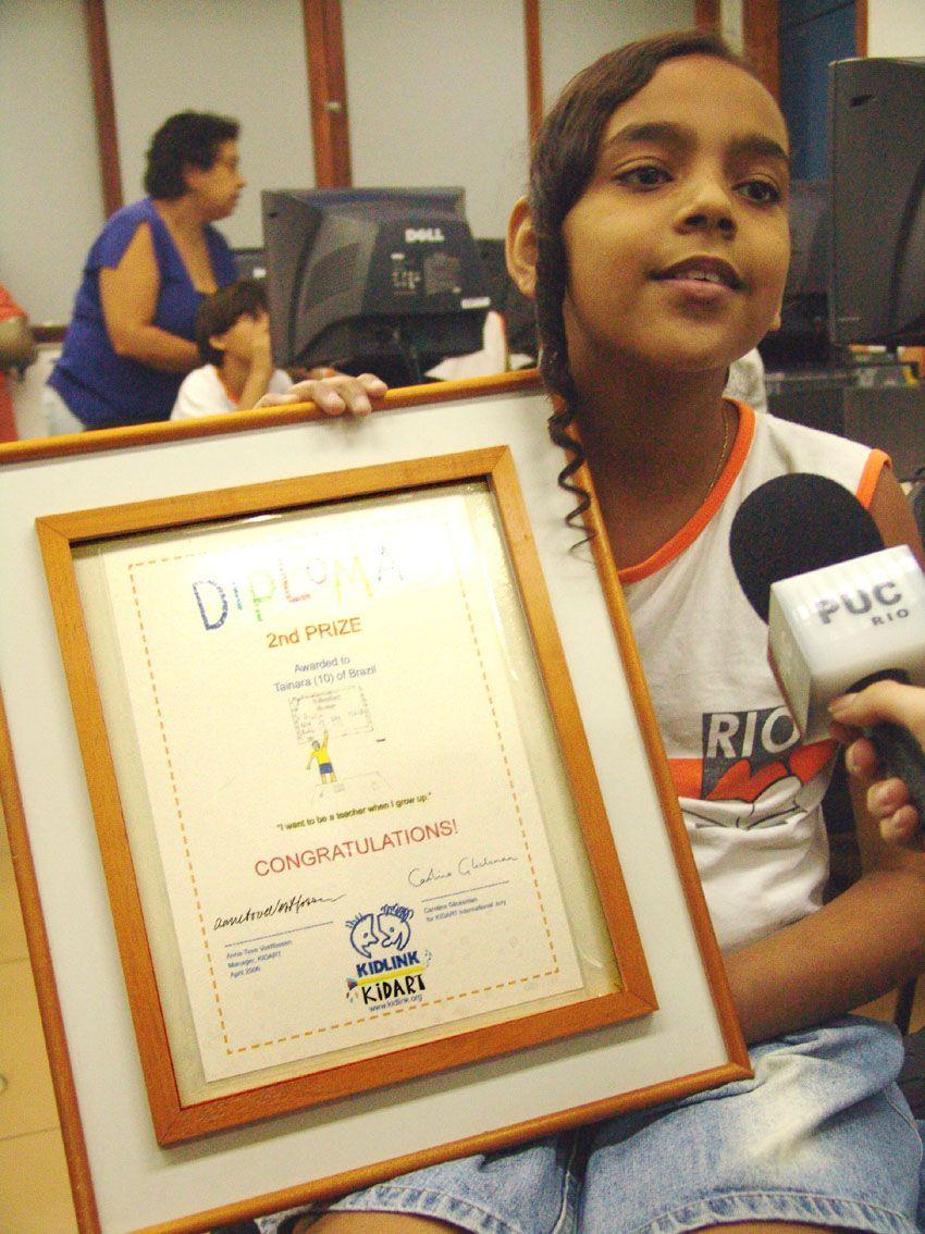 Tainara Gomes de Souza, de 9 anos, com o diploma que registra sua vitória na competição internacional "Como eu me vejo na minha profissão do futuro?". Crianças de 164 países participaram. Tainara, da 4ª série da Escola Municipal Luiz Delfino, se desenhou dando aula de matemática.
