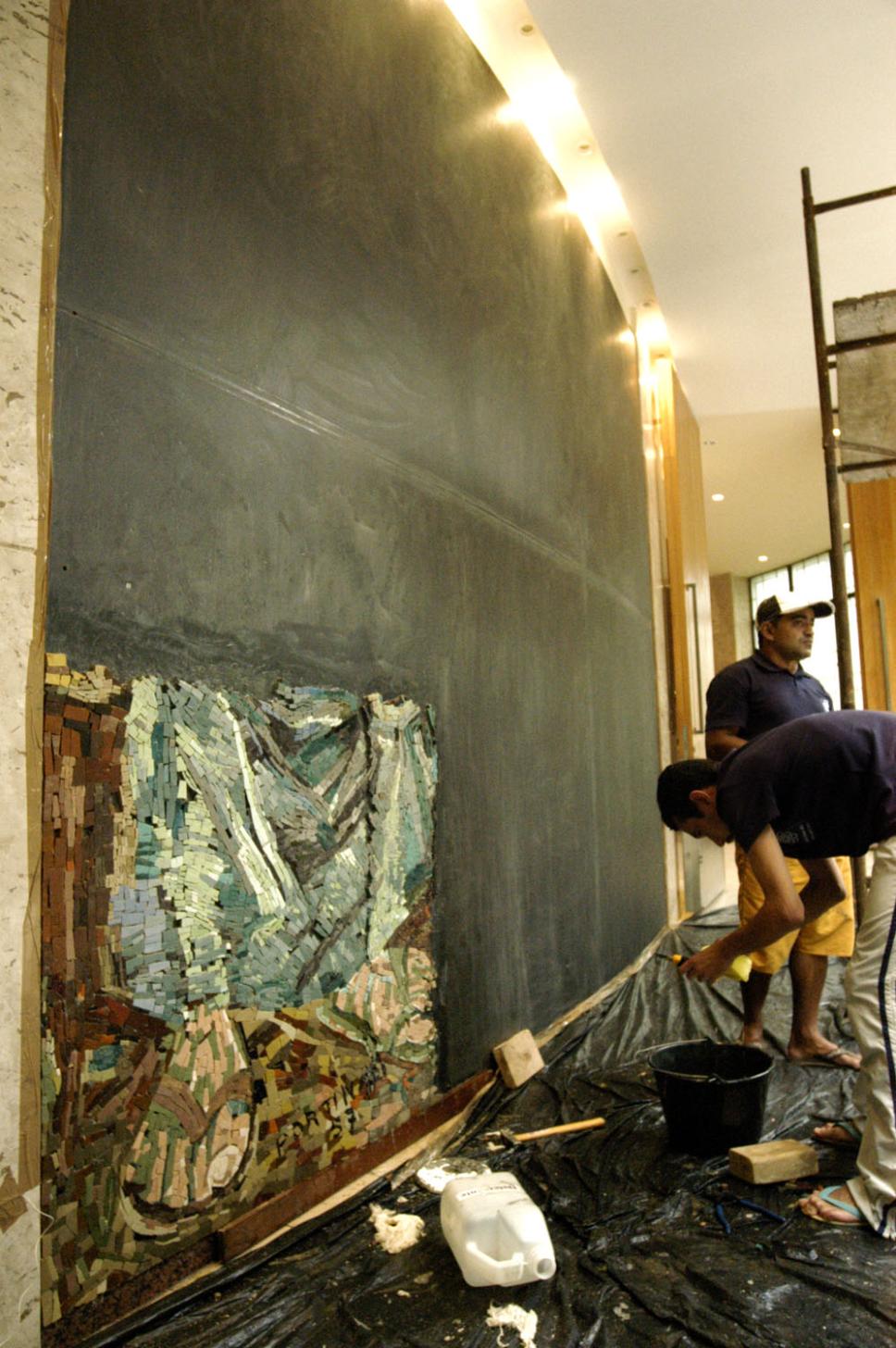 Preparação da parede para a instalação do mosaico Jesus entre os doutores, projetado por Candido Portinari.