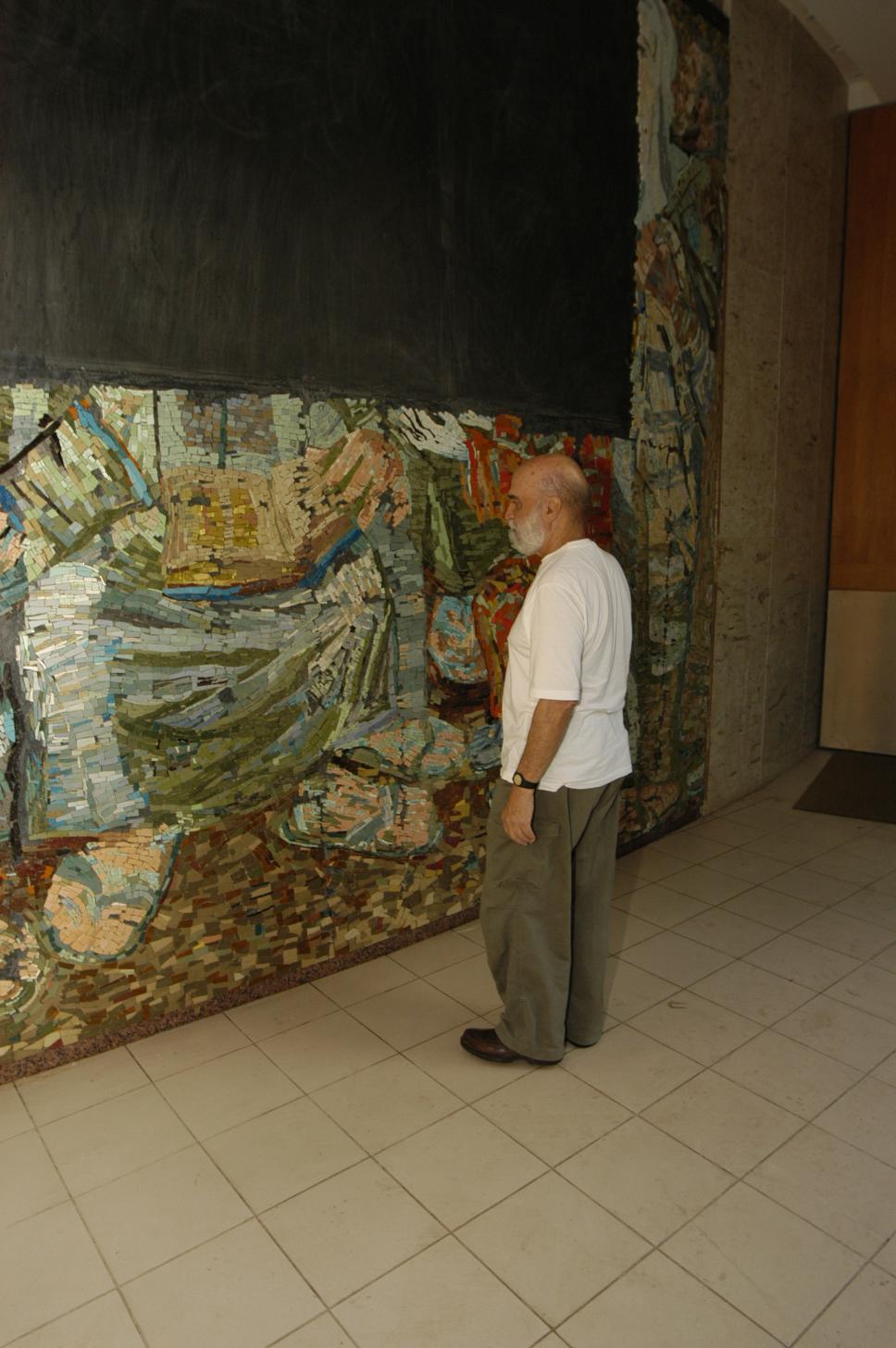 Montagem do mosaico Jesus entre os doutores, projetado por Candido Portinari. Vistoria por um técnico da empresa responsável.