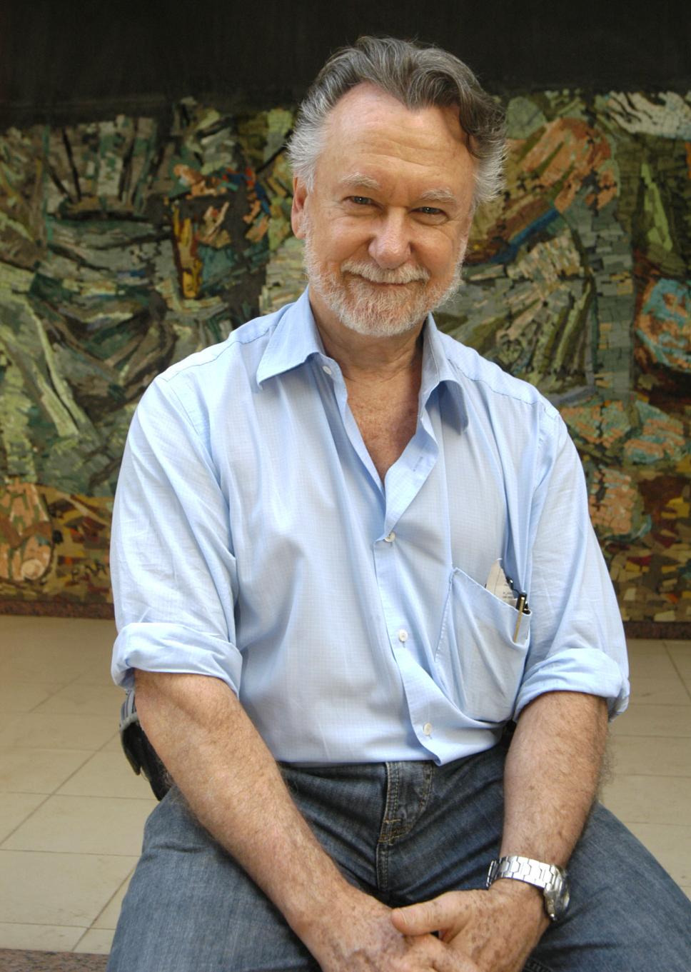 Prof. João Cândido Portinari em frente ao mosaico em montagem, Jesus entre os doutores, projetado por Candido Portinari.