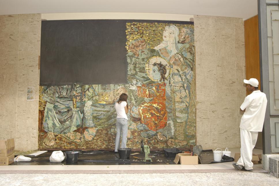 Montagem do mosaico Jesus entre os doutores, projetado por Candido Portinari. Vistoria por uma técnica da empresa responsável.