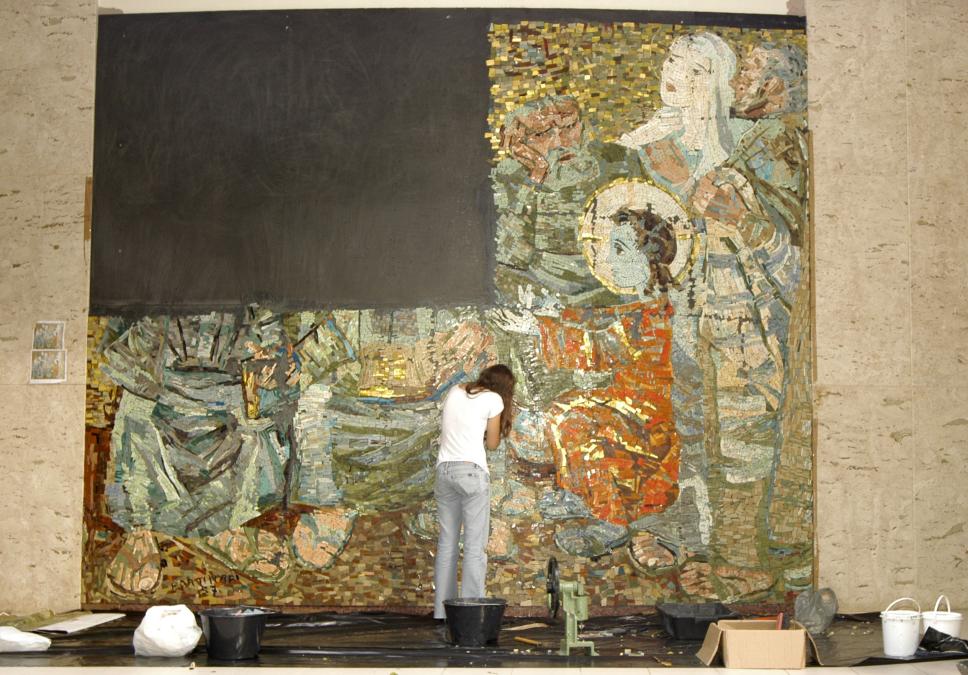 Montagem do mosaico Jesus entre os doutores, projetado por Candido Portinari. Vistoria por uma técnica da empresa responsável.