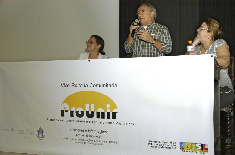 Professor Augusto Sampaio fala em palestra de lançamento do projeto ProUnir, direcionado a alunos bolsistas, com orientação profissional, oficinas de leitura e escrita, raciocínio lógico e história da arte e oficinas comunitárias interdisciplinares.