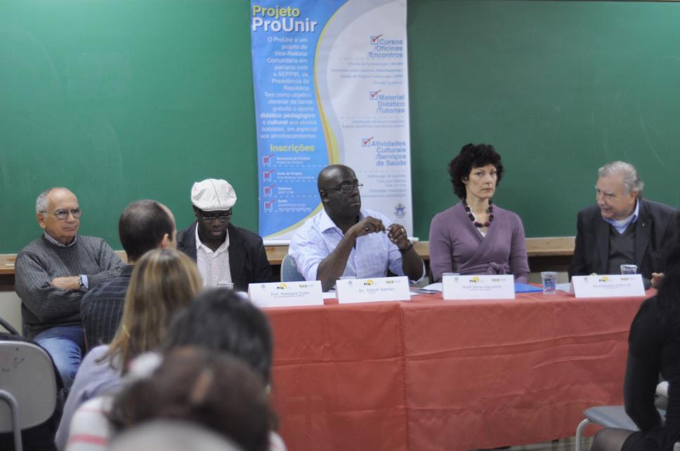 Evento do projeto ProUnir para discutir o Estatuto da Igualdade Racial. Palestra do deputado federal Edson Santos (PT), com a presença do Vice-Reitor pe. Ivern S.J., do Vice-Reitor Comunitário prof. Augusto Sampaio, e dos professores Madianane Diallo (IND) e Sonia Giacomini (CIS). Sala F201A.