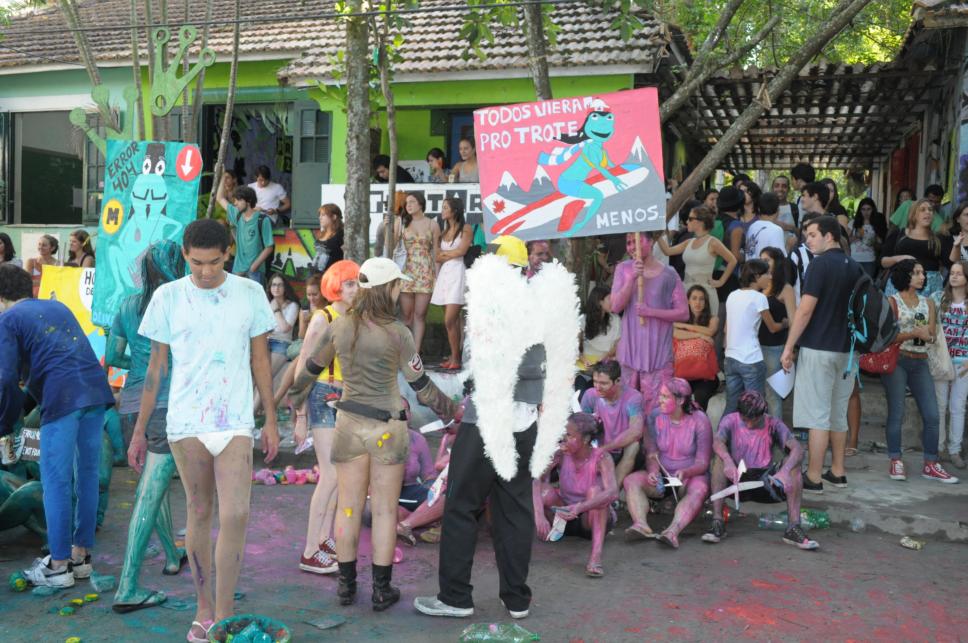 Alunos fantasiados e pintados participam de trote.