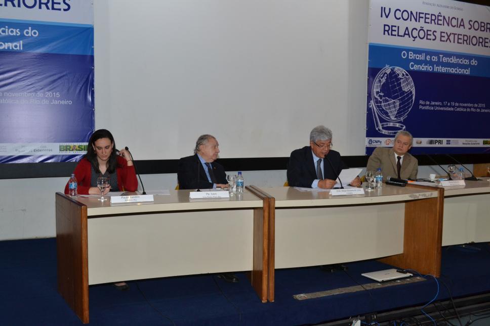 Da esq. a dir.: 1º Paula Sandrin (IRI), 2° pe. Francisco Ivern Simó S.J. (Vice-Reitor), 3° emb. Sérgio Eduardo M. Lima (FUNAG) e 4° Paulo Esteves (BPC/IRI).