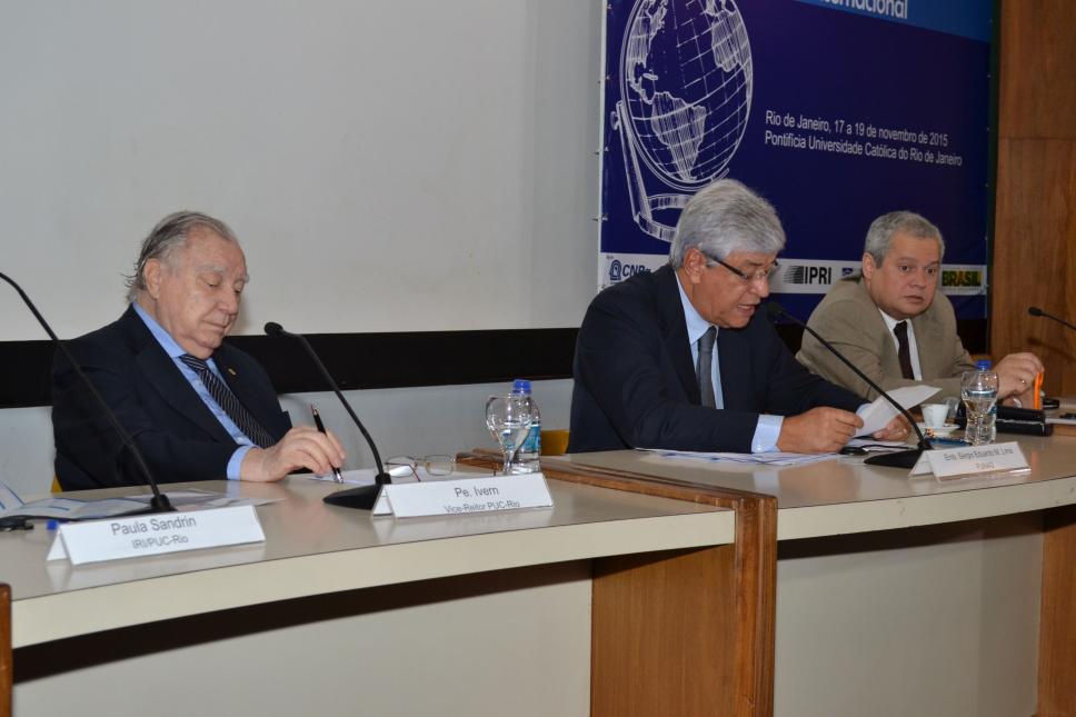 Da esq. p/ dir.: 1°pe Francisco Ivern Simó S.J. (Vice-Reitor), 2° emb. Sérgio Eduardo M. Lima (FUNAG) e 3° Paulo Esteves (BPC/IRI).