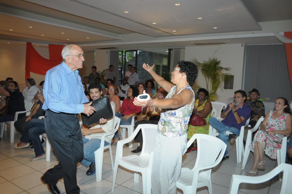 Padre Javier Enciso cumprimenta a funcionária Dora no evento em sua homenagem.