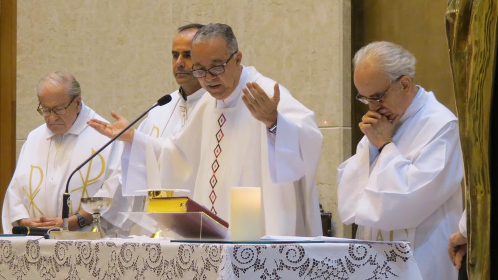 Reitor Padre Josafá abençoa a hóstia durante o rito da comunhão.