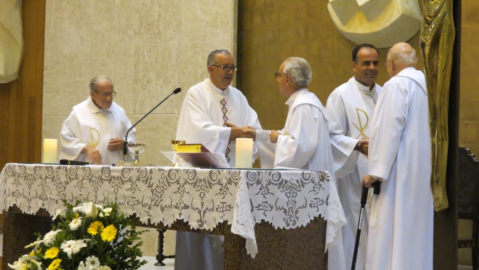 Da esq. para dir.: 1° prof. pe. Jesús Hortal Sànchez S.J. (TEO), 2° prof. pe. Josafá Carlos de Siqueira S.J. (BIO, Reitor), 3° prof. pe. Pedro Magalhães Guimarães Ferreira S.J. (ELE), 4° prof. pe. Luís Corrêa Lima S.J. (TEO), 5° prof. pe. Amarilho Checon S.J.