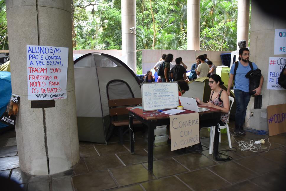 Mesa com quadro de avisos com a programação das atividades da ocupação.
