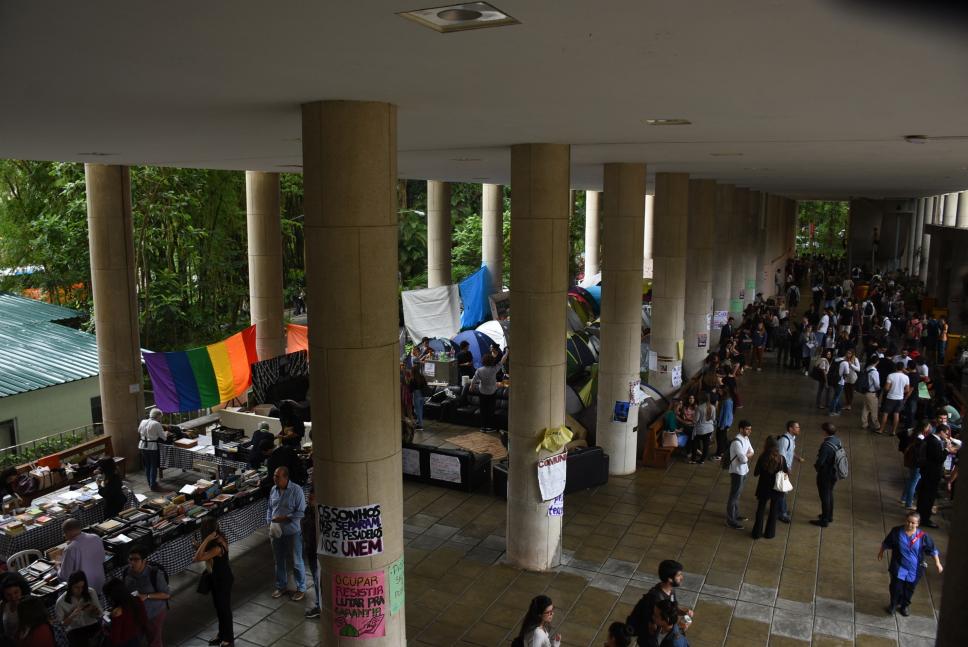 Vista panorâmica dos pilotis ocupado e com venda de livros usados.