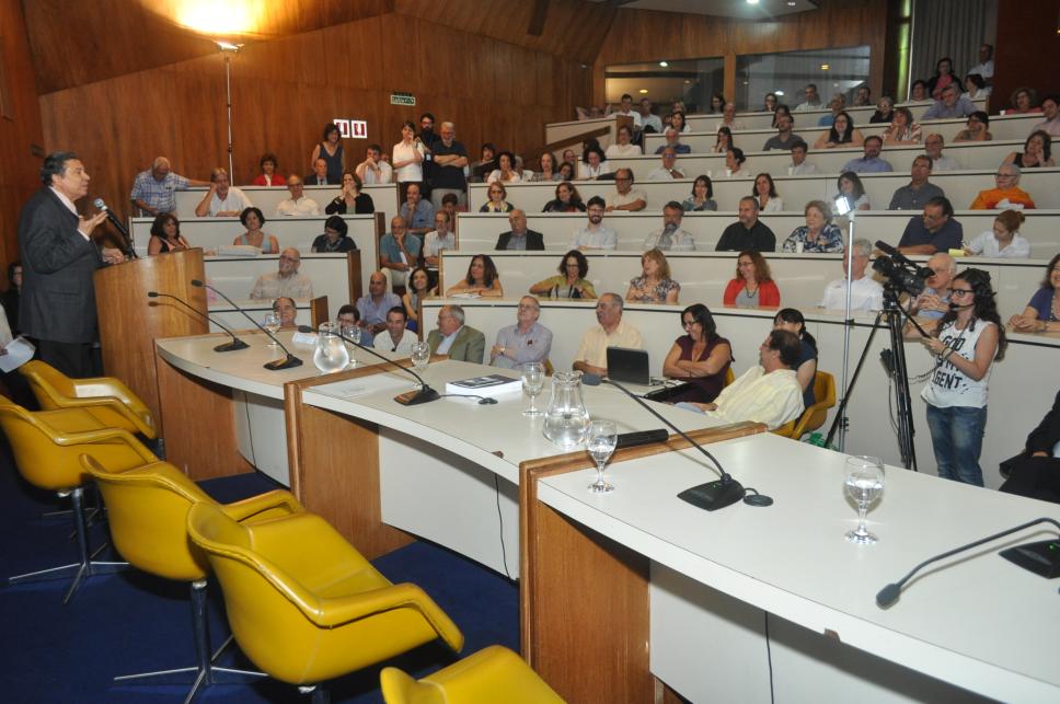 No púlpito ao microfone: prof. Luiz Carlos Scavarda do Carmo (FIS, Vice-Reitor para Assuntos Administrativos); 1ª fila de cadeiras da esq. para dir.: prof. Luiz Roberto Azevedo Cunha (ECO, Decano CCS), prof. Luiz Alencar Reis da Silva Mello (CETUC, Decano do CTC), prof. Sidnei Paciornik (DEMA), prof. Augusto Sampaio (Augusto Luiz Duarte Lopes Sampaio) (COM, Vice-Reitor para Assuntos Comunitários), prof. Danilo Marcondes de Souza Filho (FIL), prof. Miguel Serpa Pereira (COM), profa. Lilian Saback de Sá Moraes (COM), n.i., prof. Júlio Cesar Valladão Diniz (LET), n.i.