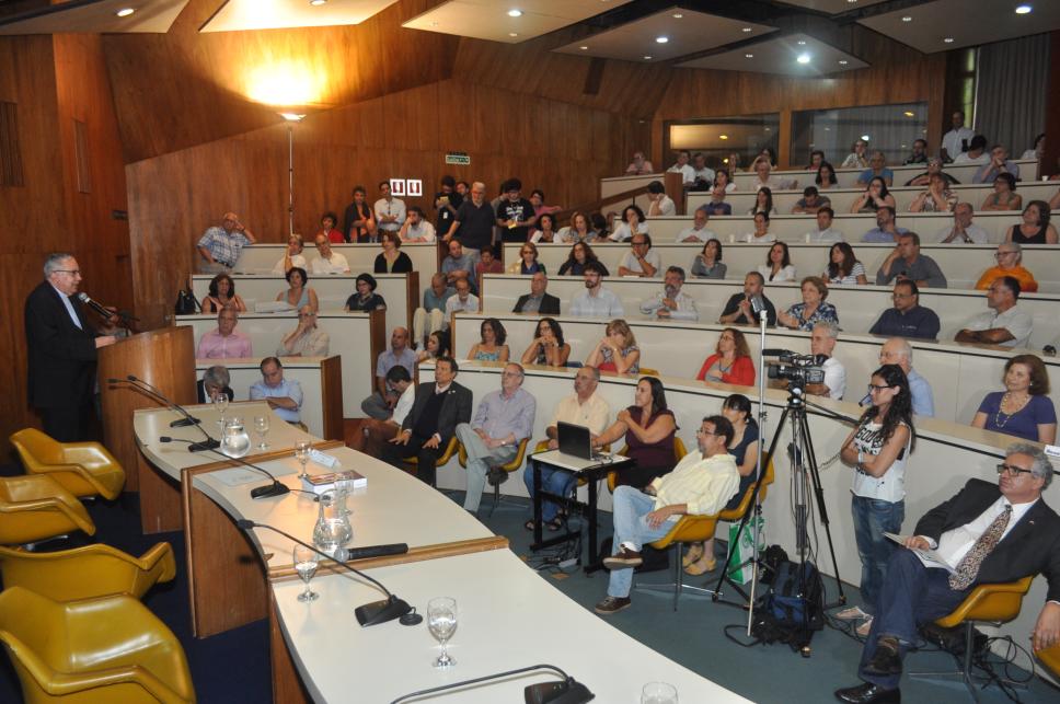 Na mesa ao microfone: prof. pe. Josafá Carlos de Siqueira S.J. (BIO, Reitor); 1ª fila de cadeiras da esq. para dir.: prof. José Ricardo Bergmann (CETUC, Vice-Reitor para Assuntos Acadêmicos), prof. Luiz Roberto Azevedo Cunha (ECO, Decano CCS), prof. Sidnei Paciornik (DEMA), prof. Luiz Carlos Scavarda do Carmo (FIS, Vice-Reitor para Assuntos Administrativos), prof. Danilo Marcondes de Souza Filho (FIL), prof. Miguel Serpa Pereira (COM), profa. Lilian Saback de Sá Moraes (COM), n.i., prof. Júlio Cesar Valladão Diniz (LET), n.i. e o prof. Sérgio de Almeida Bruni (Vice-Reitor para Assuntos de Desenvolvimento)