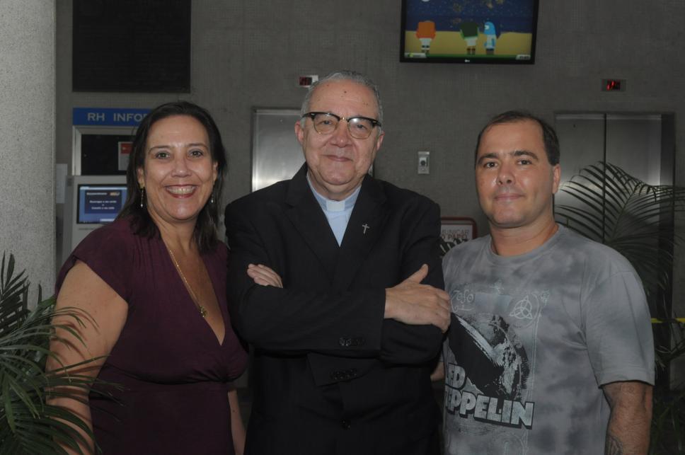 Da esq. para dir.: profa. Lilian Saback de Sá Moraes (COM), prof. pe. Josafá Carlos de Siqueira S.J. (BIO, Reitor) e o prof. Carlos Roberto Cerqueira Alves (COM)