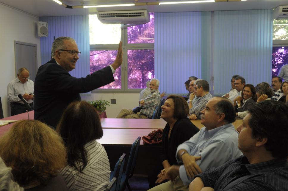 prof. pe. Josafá Carlos de Siqueira S.J. (BIO, Reitor), em pé acenando; profa. Marlene Sabino Pontes (CETUC), de roupa na cor preta sorri para o pe. Josafá S.J; prof. Luiz Roberto Azevedo Cunha (ECO, Decano CCS), ao lado da profa. Marlene