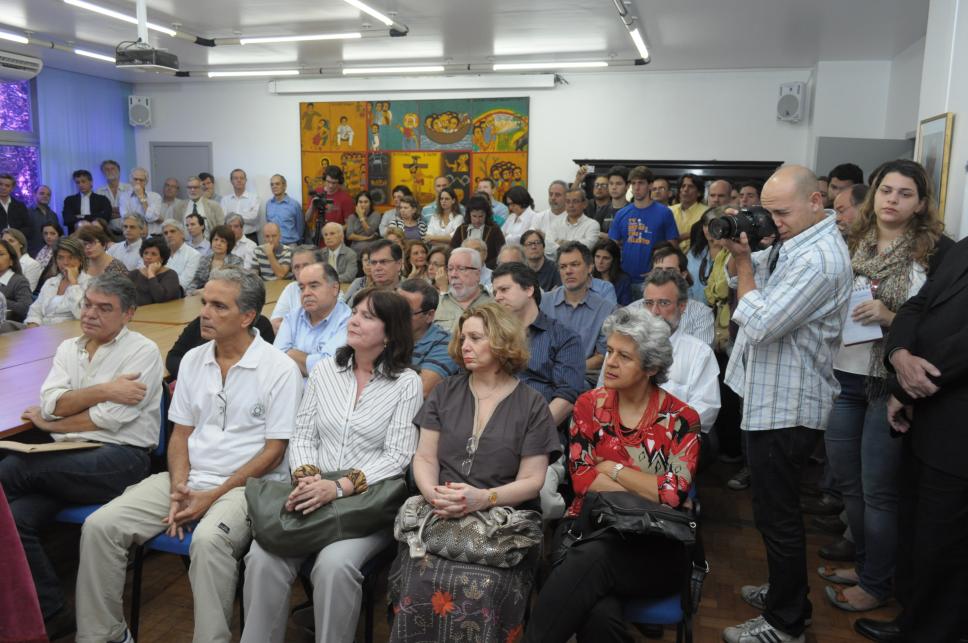 Primeira fila da esq. para dir.: n.i., prof. José Eugênio Leal (IND), n.i., profa. Rosa Marina de Brito Meyer (LET) e a profa. Luiza Helena Nunes Ermel (SER)