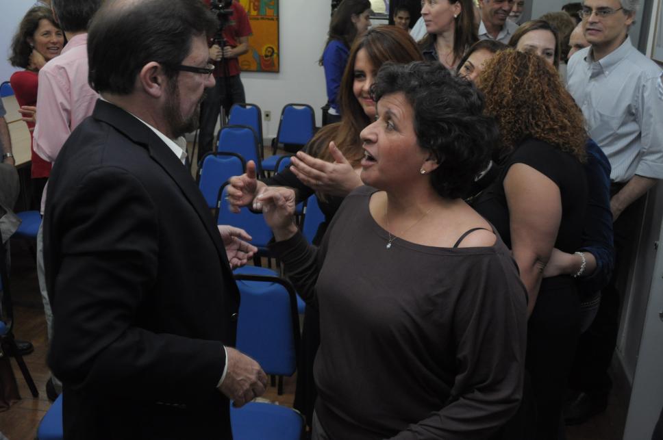 Funcionária Célia Pereira parabeniza o Professor Silva Mello.