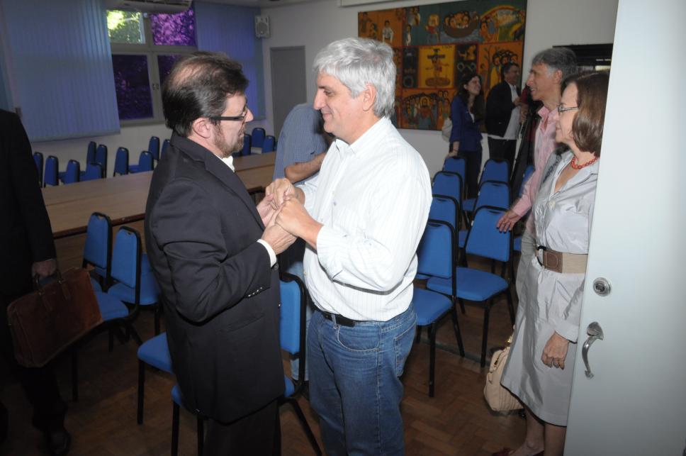 O professor Silva Mello recebe os cumprimentos do professor Alfredo Jefferson .