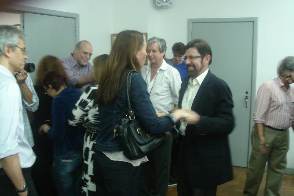 A coordenadora de pesquisa do Núcleo de Memória, profa. Silvia Ilg, cumprimenta o professor Silva Mello.