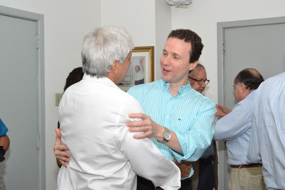 Professores Luiz Felipe Scavarda e Alfredo Jefferson se cumprimentam após a cerimônia.