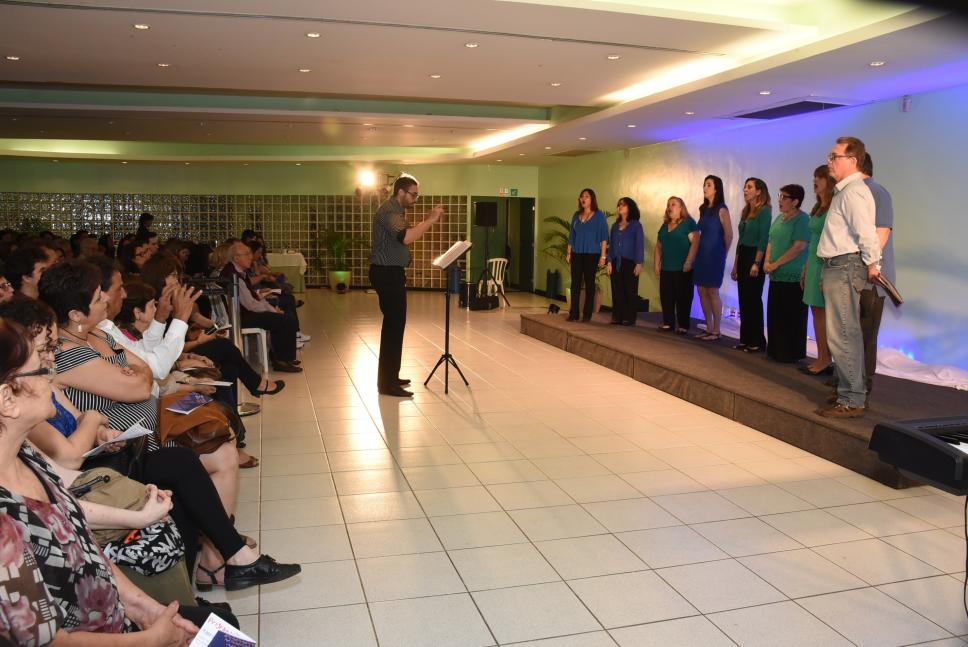 Apresentação do Coro Coruja e plateia presente no encontro.