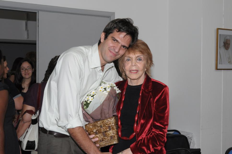 A professora Sônia de Camargo posa para foto com convidado presente na homenagem.