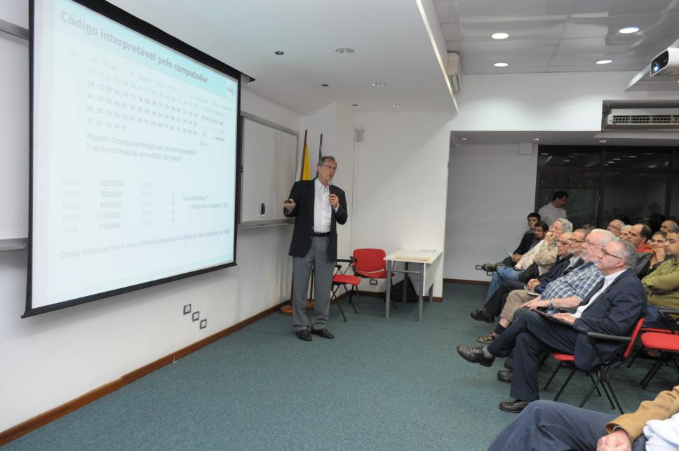 No microfone: prof. Arndt von Staa (INF). Primeira fila, da esq. p/ dir.: 1° n.i., 2° prof. Luiz Alencar Reis da Silva Mello (CETUC, Decano do CTC), 3° n.i., 4° n.i., 5° prof. pe. Pedro Magalhães Guimarães Ferreira S.J. (ELE), 6° prof. pe. Paul Alexander Schweitzer S.J. (MAT), 7° prof. Carlos Lucena (Carlos José Pereira de Lucena) (INF), 8° prof. pe. Josafá Carlos de Siqueira S.J. (BIO, Reitor)