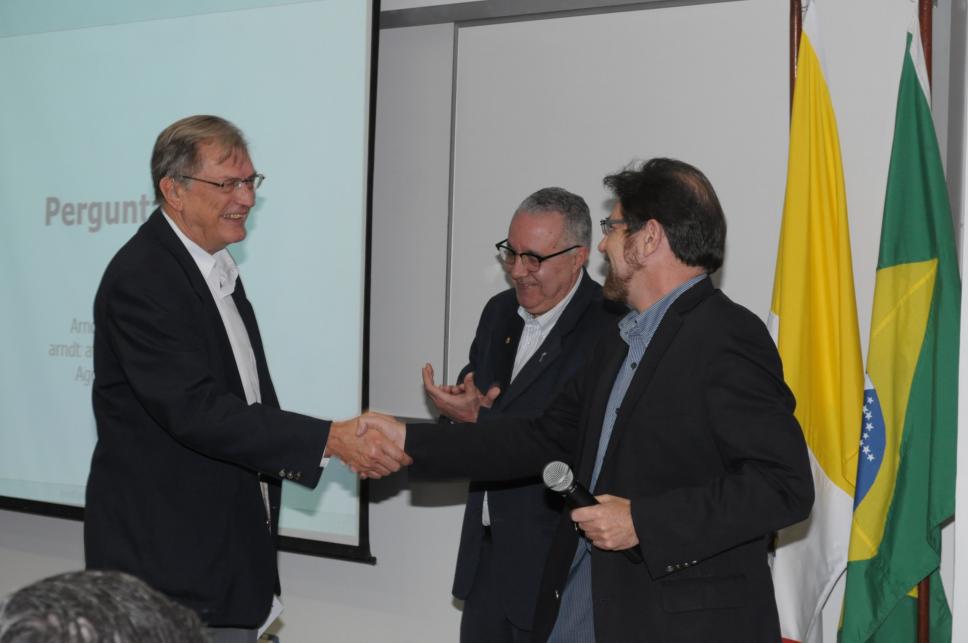 Professor Arndt von Staa recebe os cumprimentos do Decano do Centro Técnico Científico da PUC-Rio, professor Silva Mello.