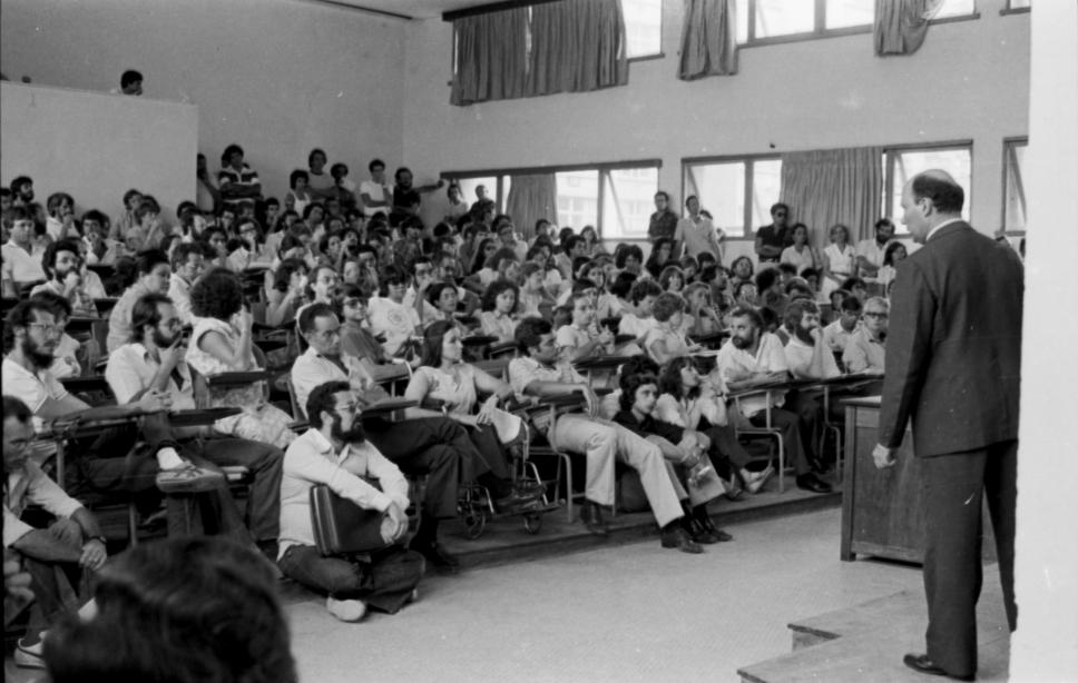 Assembleia com Reitor sobre a demissões de professores em 1981