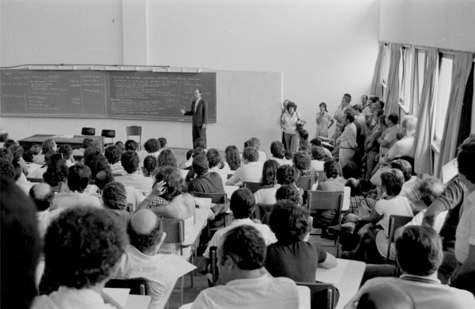 O Reitor Padre Mac Dowell S.J. em pé, na frente da plateia reunida em assembleia, expõe as perspectivas da Administração Central da PUC-Rio para as demissões.