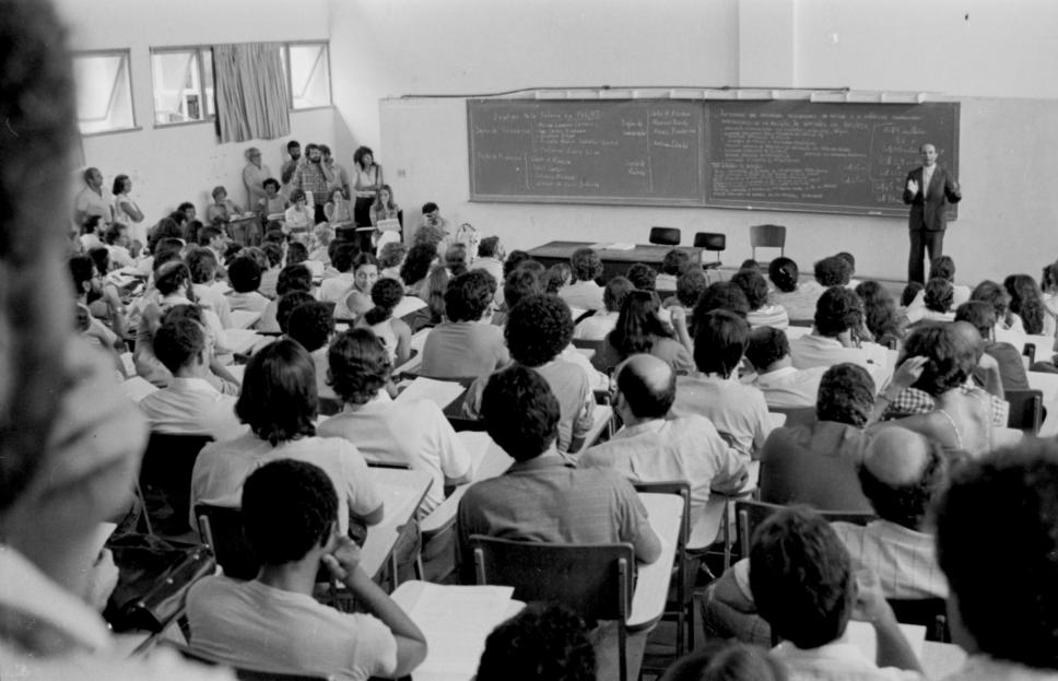 Fala do Reitor Padre Mac Dowell S.J. na assembleia sobre a demissão de funcionários.