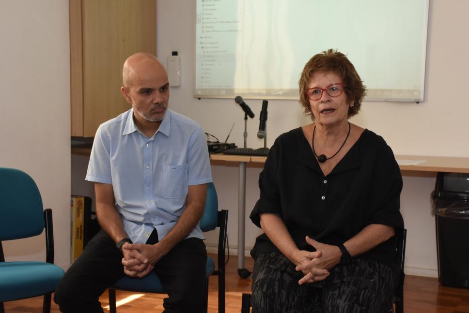 Professores Eneida Leal e Frederico Coelho participam da roda de conversa sobre jongo.