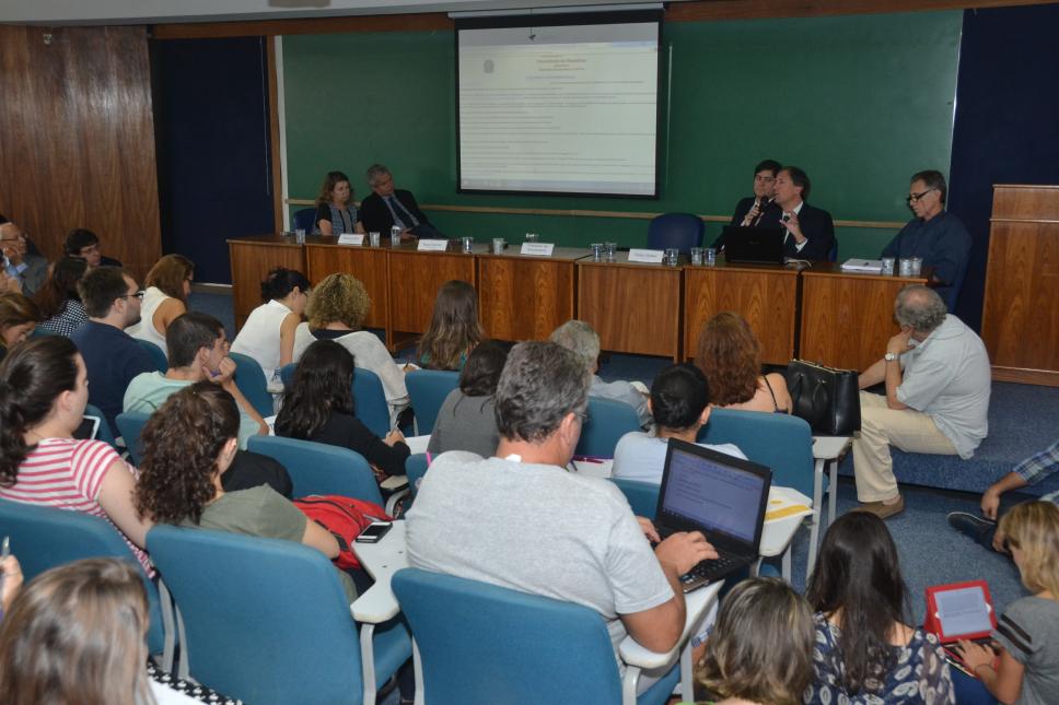 Da esq. para dir.: profa. Monica Herz (IRI), prof. Paulo Luiz Moreaux Lavigne Esteves (IRI), prof. Francisco de Guimaraens (JUR), prof. Pedro Dallari (USP), prof. João Ricardo Wanderley Dornelles (JUR).