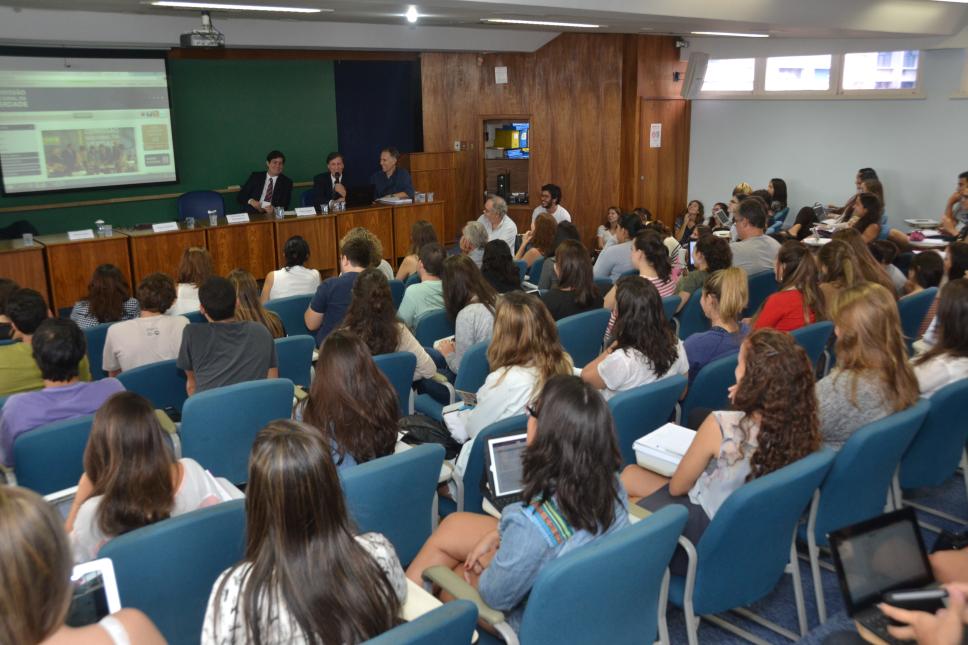 Na mesa da esq. para dir.: prof. Francisco de Guimaraens (JUR), prof. Pedro Dallari (USP), prof. João Ricardo Wanderley Dornelles (JUR).