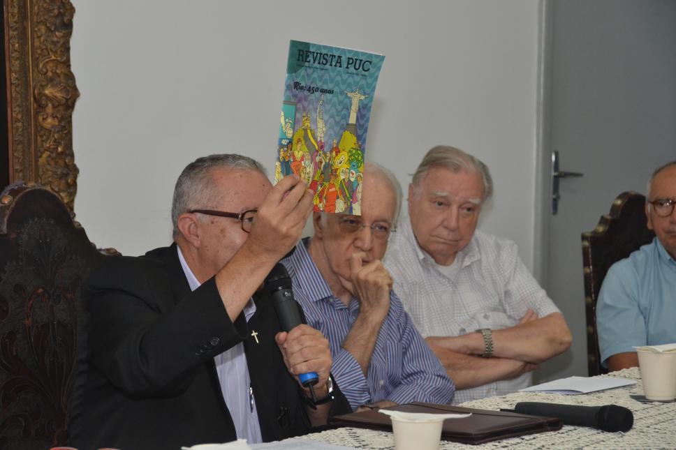 O Reitor Prof. Pe. Josafá S.J. exibe a edição de março de 2015 da Revista PUC, publicação do Projeto Comunicar em homenagem aos 450 anos da cidade do Rio de Janeiro.