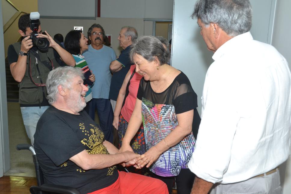 A nova Diretora do Departamento de Comunicação Social, professora Angeluccia Habert, recebe os cumprimentos do professor Sílvio Tendler.