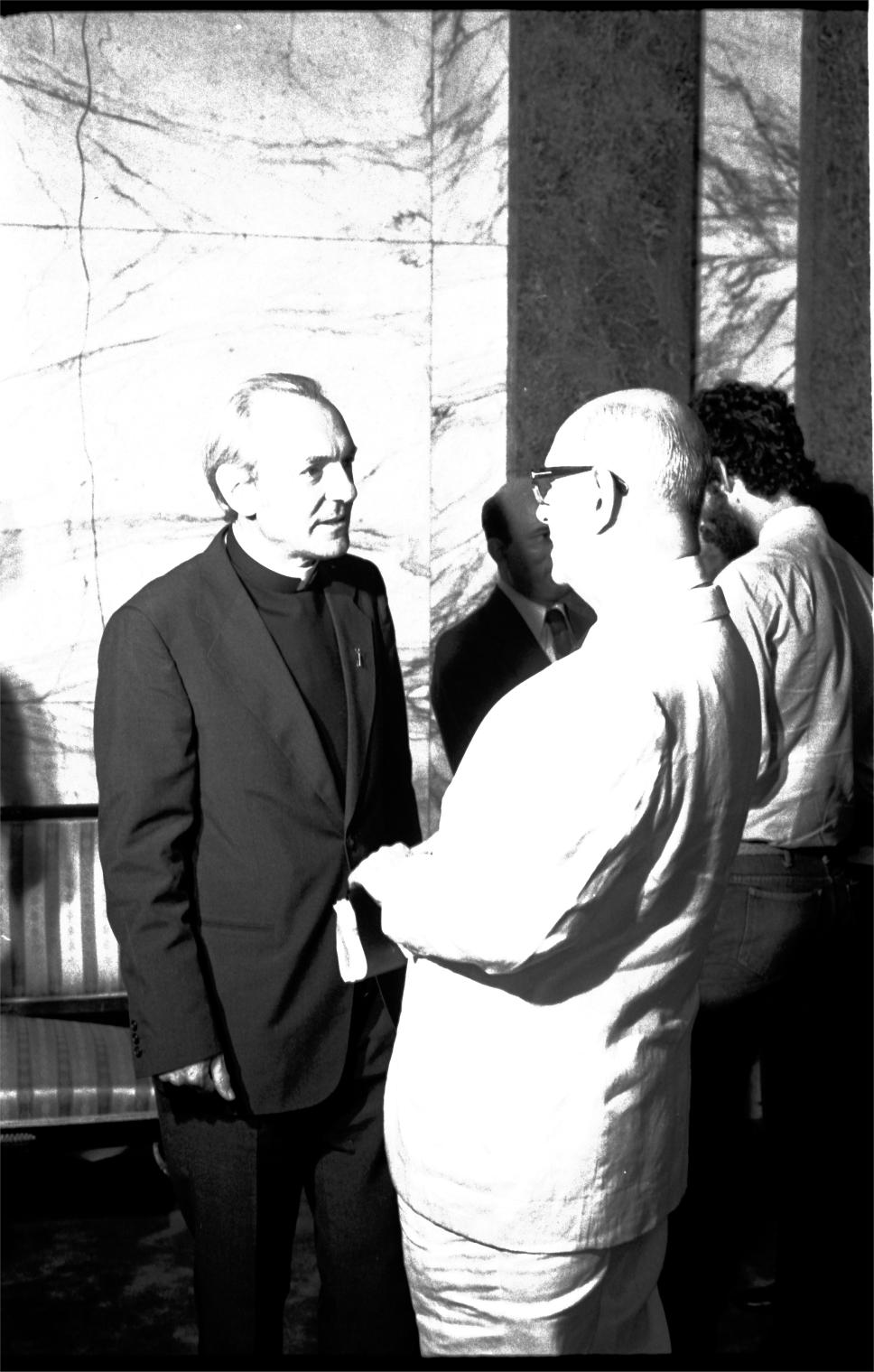 Governador Chagas Freitas conversa com Dom Afonso Gregory, representante do Cardeal. Ao fundo o então Reitor, Pe. Mac Dowell.