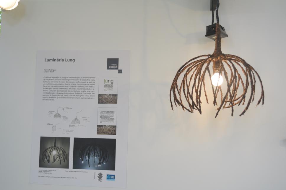 Luminária Lung feita com vegetação do mangue exposta durante a Semana de Design da PUC-Rio.