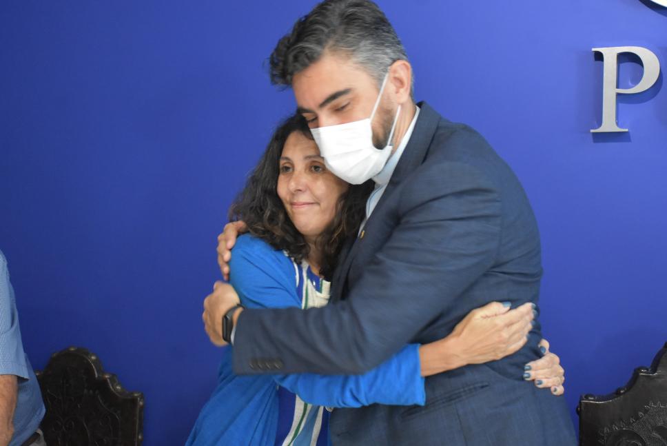 Abraço entre a profa. Jackeline Lima Farbiarz e o reitor prof. pe. Anderson Antonio Pedroso S.J..