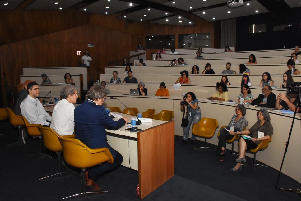 Na mesa da esq. para dir.: prof. Otávio Leonídio Ribeiro (DAD), pe. Álvaro Mendonça Pimentel S.J. (Vice-Reitor), prof. Marcelo Tadeu Baumann Burgos (SOC) e prof. Afonso Nuno Martins (Universidade de Lisboa)